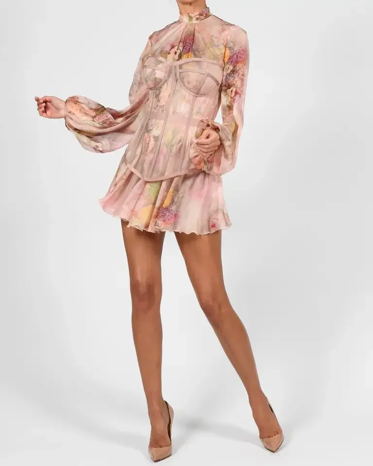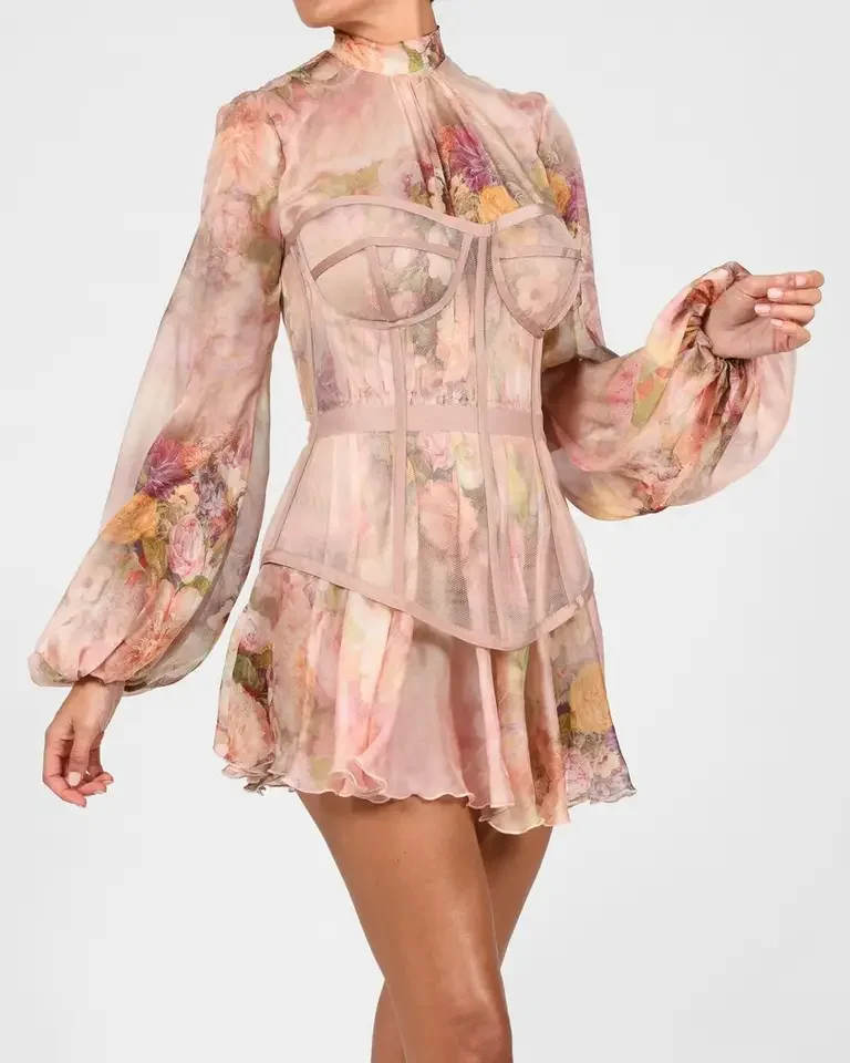 New Fund Bohemia Wind Restore Ancient Ways to Receive Waist Print Irregular Temperament Long Sleeve Stand Collar Dress